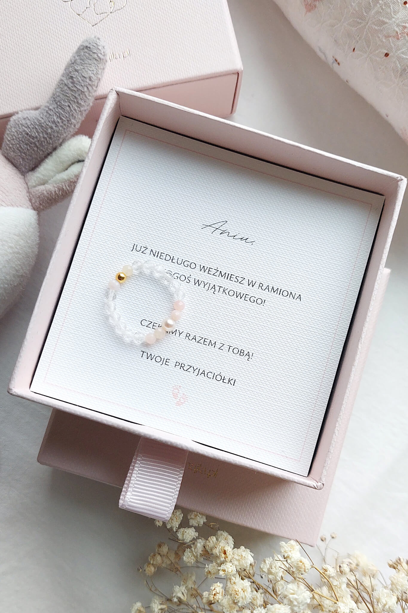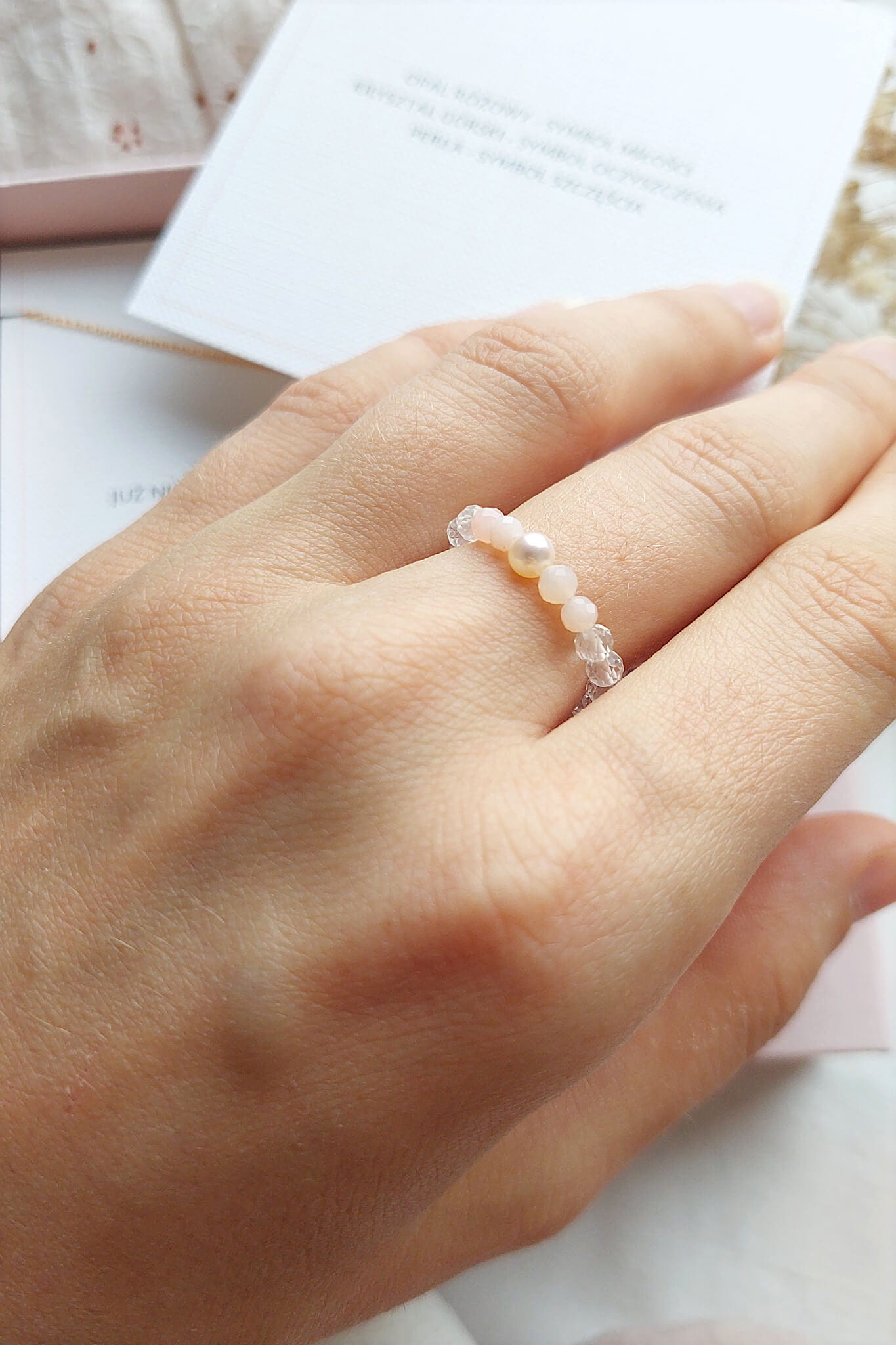 Pierścionek elastyczny dla Przyszłej Mamy Baby Shower perła opal różowy kryształ górski