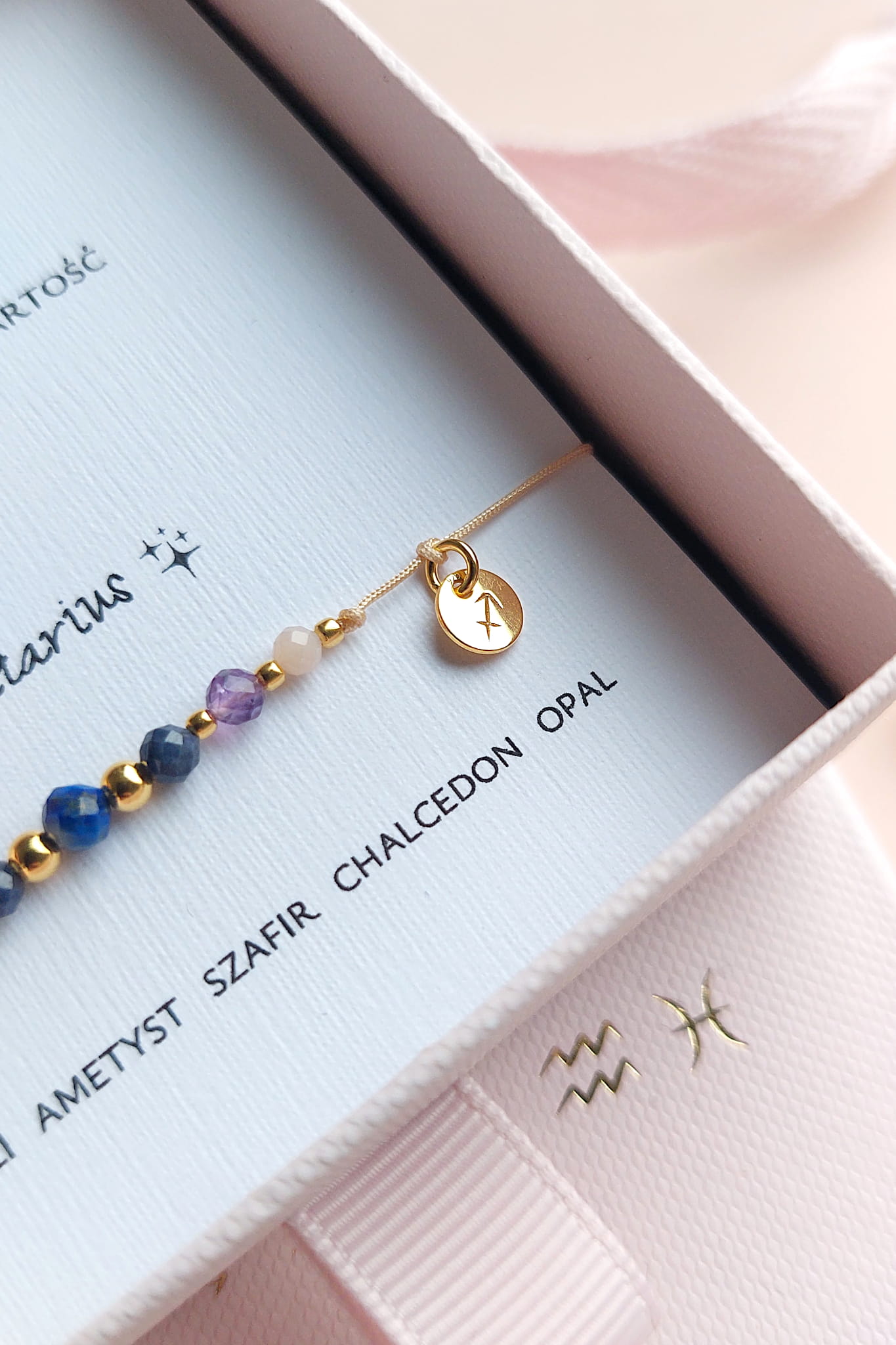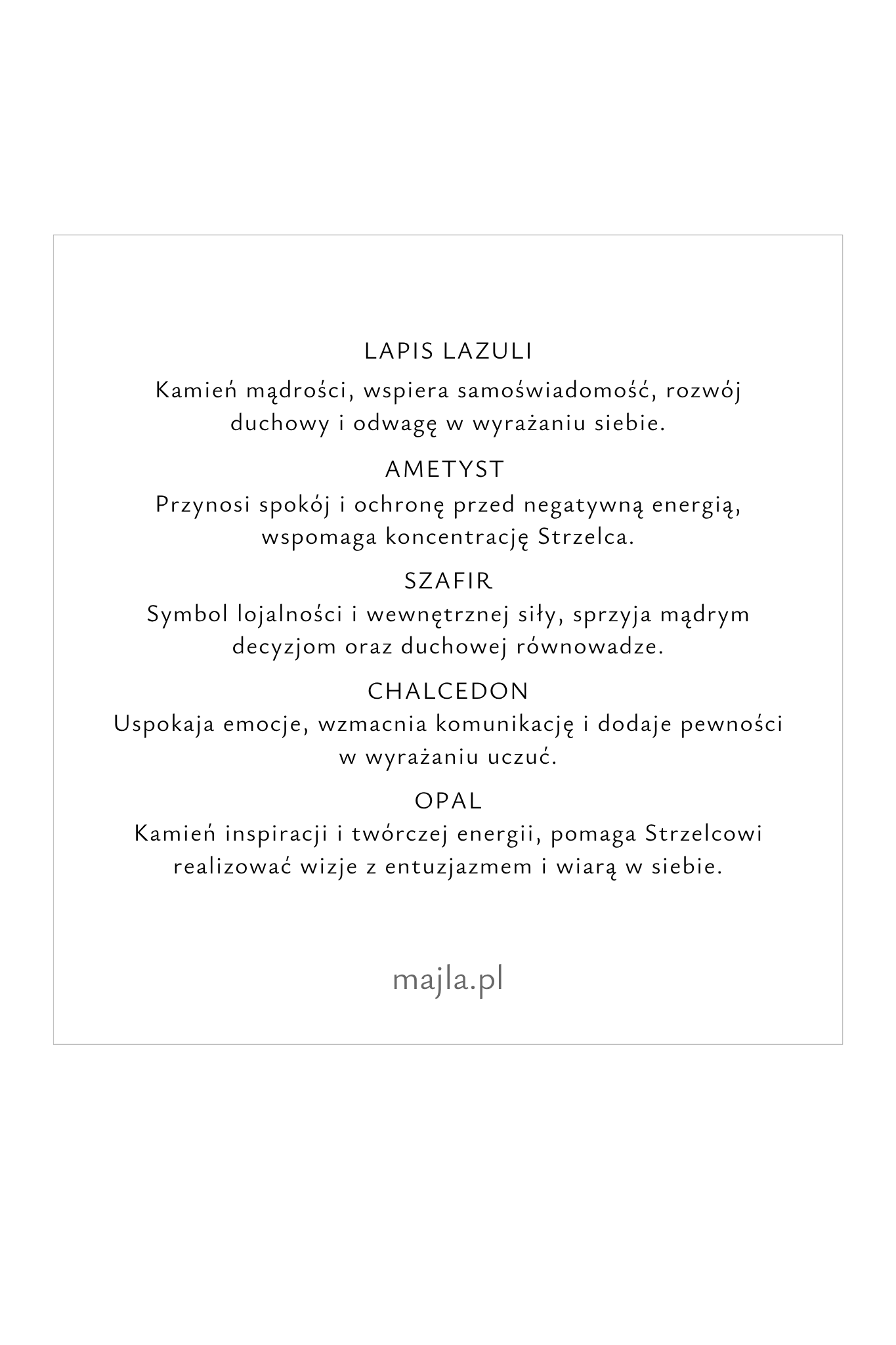 Bransoletka inspirowana znakiem Strzelca – symbolem optymizmu i wewnętrznej mądrości. Połączenie kamieni naturalnych – lapis lazuli, ametystu, szafiru, chalcedonu i opalu – tworzy harmonijną kompozycję energii, odwagi i równowagi. Lapis lazuli wspiera szczerość i rozwój duchowy, ametyst uspokaja umysł i chroni przed negatywną energią, szafir sprzyja prawdzie i wewnętrznej sile, chalcedon przynosi spokój i równowagę, a opal pobudza kreatywność oraz inspiruje do działania. To nie tylko ozdoba, ale także osobisty amulet Strzelca – wspierający go w realizacji marzeń i dążeniu do celu.